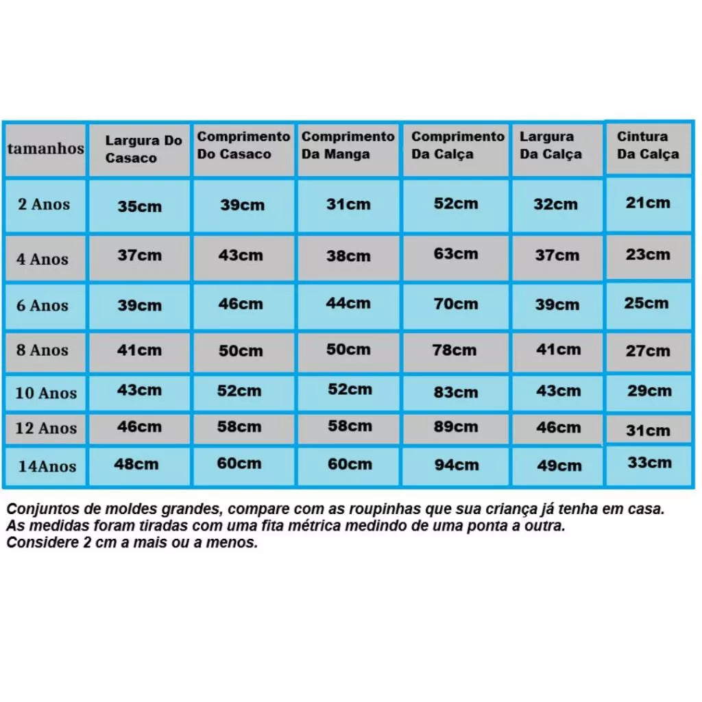 Tabela de Medidas Casaco 2 Anos Largura 35cm / Comprimento 39cm / Manga 31cm 4 Anos Largura 37cm / Comprimento 43cm / Manga 38cm 6 Anos Largura 39cm / Comprimento 46cm / Manga 44cm 8 Anos Largura 41cm / Comprimento 50cm / Manga 50cm 10 Anos Largura 43cm / Comprimento 52cm / Manga 52cm 12 Anos Largura 46cm / Comprimento 58cm / Manga 58cm 14 Anos Largura 48cm / Comprimento 60cm / Manga 60cm Calça 2 Anos Largura 32cm / Comprimento 52cm 4 Anos Largura 37cm / Comprimento 63cm 6 Anos Largura 39cm / Comprimento 70cm 8 Anos Largura 41cm / Comprimento 78cm 10 Anos Largura 43cm / Comprimento 83cm 12 anos Largura 46cm / Comprimento 89cm 14 anos Largura49cm / Comprimento 94cm